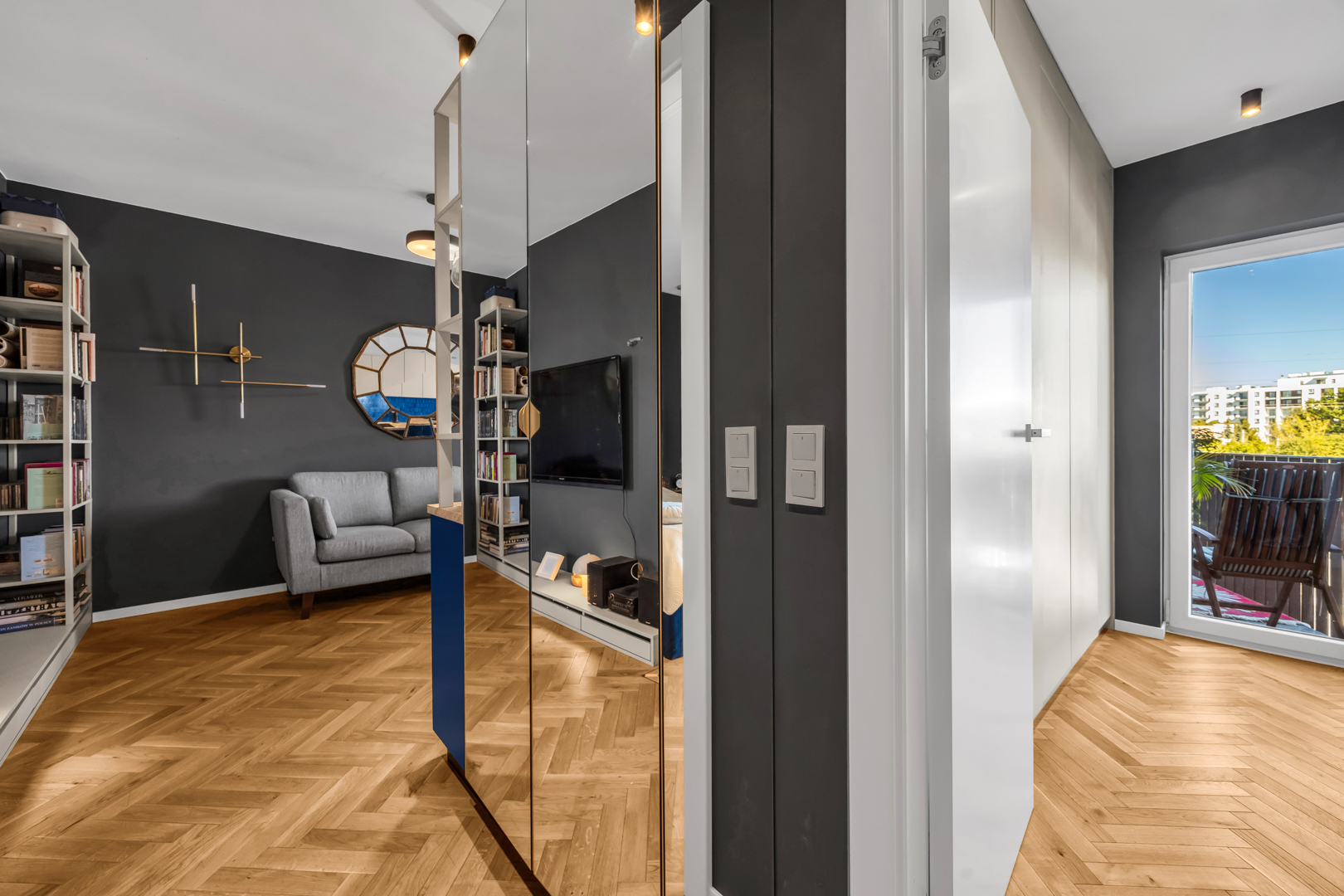 Projekt zakładał praktyczny charakter i wygodę użytkowania mieszkania. Do dyspozycji nowych właścicieli lub lokatorów, w przypadku mieszkania inwestycyjnego, będą obszerne szafy w sypialni i przedpokoju, estetycznie zaprojektowana zabudowa kuchni oraz liczne półki na książki, pamiątki czy zdjęcia. Miejsca na niezbędne wyposażenie nie zabraknie również w łazience.